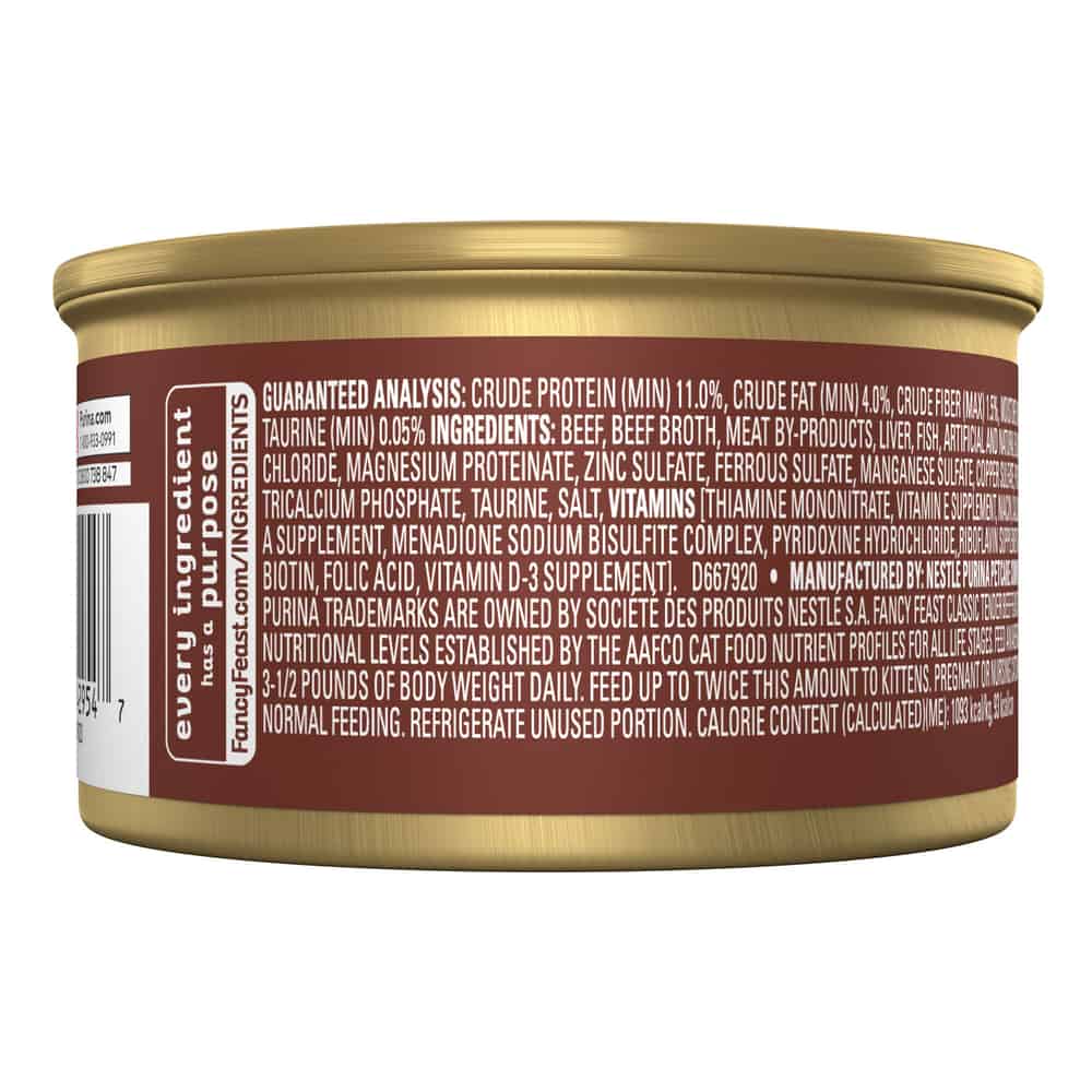 Fancy Feast Tender Beef Feast Classic Pate Cat Food is crafted in partnership with Purina's expert nutritionists and this protein-rich, grain-free cat food features the irresistible taste of real beef as the number 1 ingredient while delivering 100 percent complete and balanced nourishment.