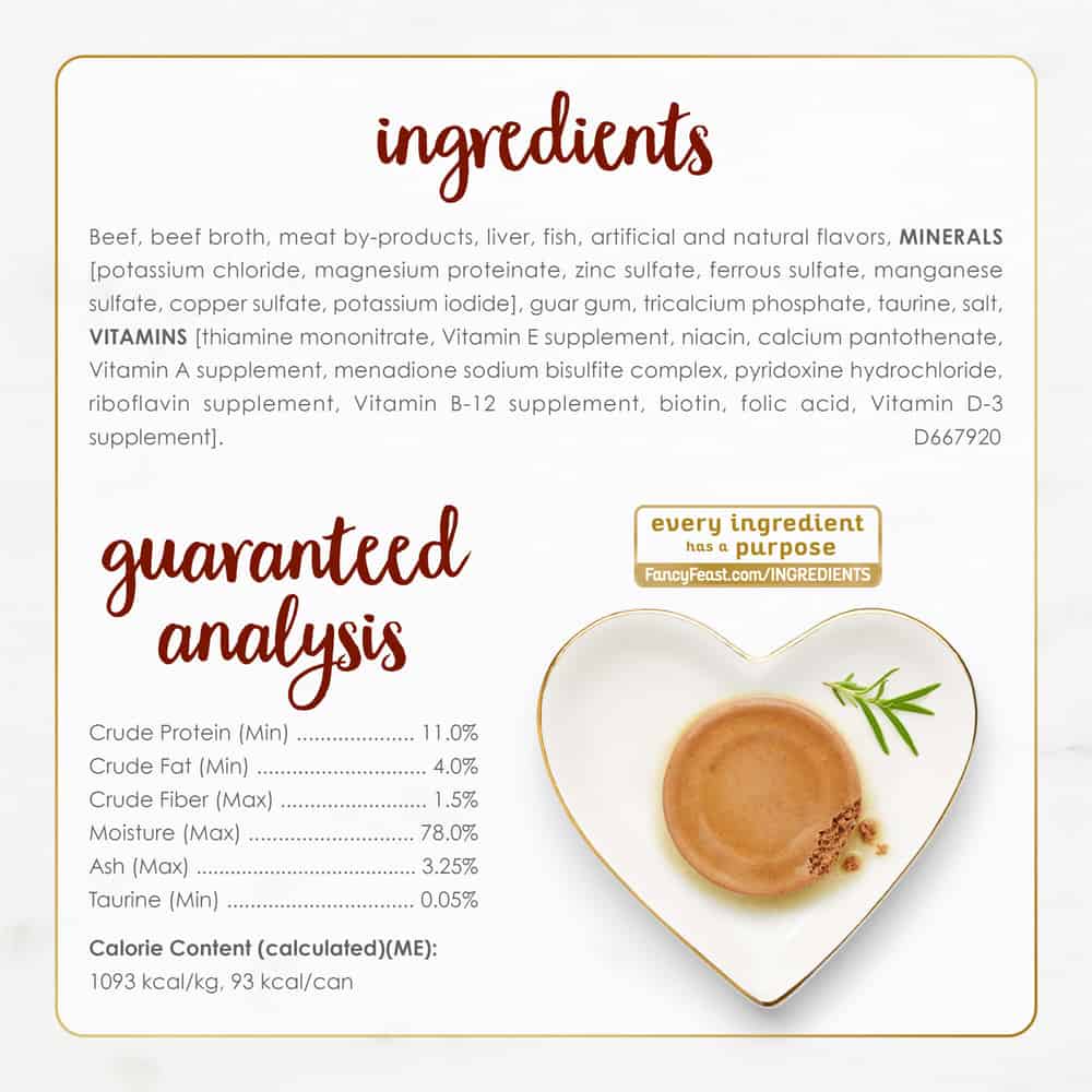 | Ingredients: Beef, Beef Broth, Meat By-products, Liver, Fish, Artificial And Natural Flavors, Minerals [Potassium Chloride, Magnesium Proteinate, Zinc Sulfate, Ferrous Sulfate, Manganese Sulfate, Copper Sulfate, Potassium Iodide], Guar Gum, Tricalcium Phosphate, Taurine, Salt, Vitamins [Thiamine Mononitrate, Vitamin E Supplement, Niacin, Calcium Pantothenate, Vitamin A Supplement, Menadione Sodium Bisulfite Complex, Pyridoxine Hydrochloride, Riboflavin Supplement, Vitamin B-12 Supplement, Biotin, Folic Acid, Vitamin D-3 Supplement]. D667920 |