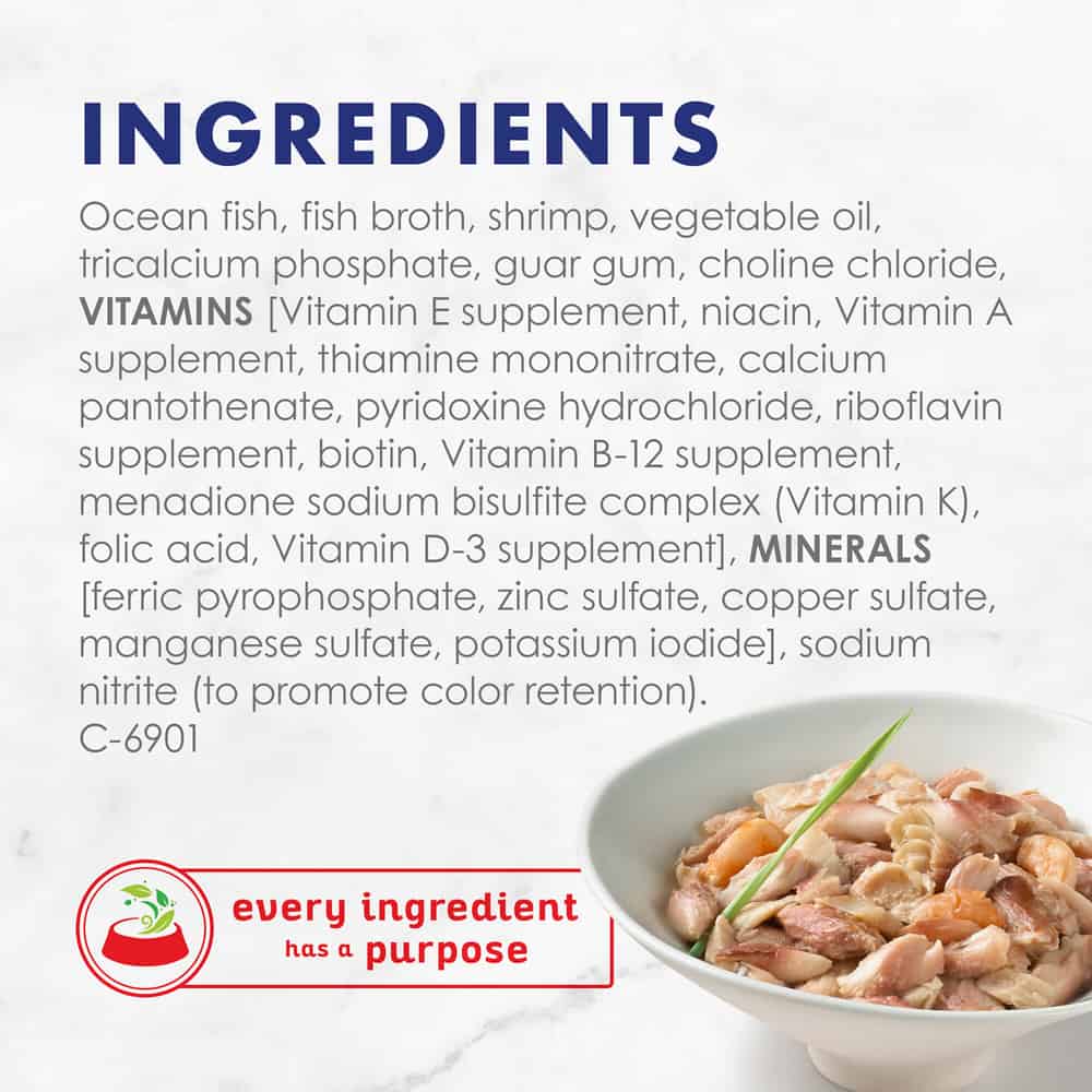 | Ingredients: Ocean Fish, Fish Broth, Shrimp, Vegetable Oil, Tricalcium Phosphate, Guar Gum, Choline Chloride, Vitamins [Vitamin E Supplement, Niacin, Vitamin A Supplement, Thiamine Mononitrate, Calcium Pantothenate, Pyridoxine Hydrochloride, Riboflavin Supplement, Biotin, Vitamin B-12 Supplement, Menadione Sodium Bisulfite Complex (Vitamin K), Folic Acid, Vitamin D-3 Supplement], Minerals [Ferric Pyrophosphate, Zinc Sulfate, Copper Sulfate, Manganese Sulfate, Potassium Iodide], Sodium Nitrite (To Promote Color Retention). C-6901. |