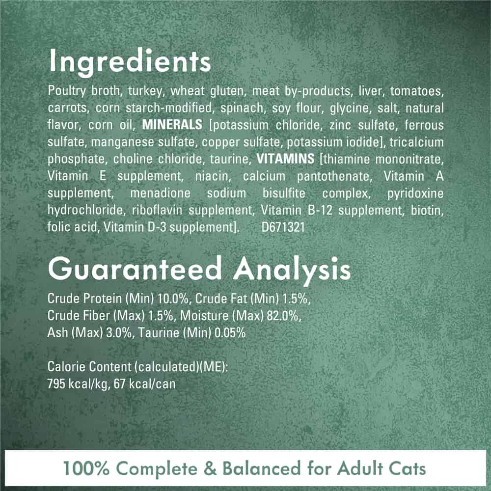 | Ingredients: Poultry Broth, Turkey, Wheat Gluten, Meat By-Products, Liver, Tomatoes, Carrots, Corn Starch-Modified, Spinach, Soy Flour, Glycine, Salt, Natural Flavor, Corn Oil, MINERALS (Potassium Chloride, Zinc Sulfate, Ferrous Sulfate, Manganese Sulfate, Copper Sulfate, Potassium Iodide), Tricalcium Phosphate, Choline Chloride, Taurine, VITAMINS (Thiamine Mononitrate, Vitamin E Supplement, Niacin, Calcium Pantothenate, Vitamin A Supplement, Menadione Sodium Bisulfite Complex, Pyridoxine Hydrochloride, Riboflavin Supplement, Vitamin B-12 Supplement, Biotin, Folic Acid, Vitamin D-3 Supplement). D671321 |