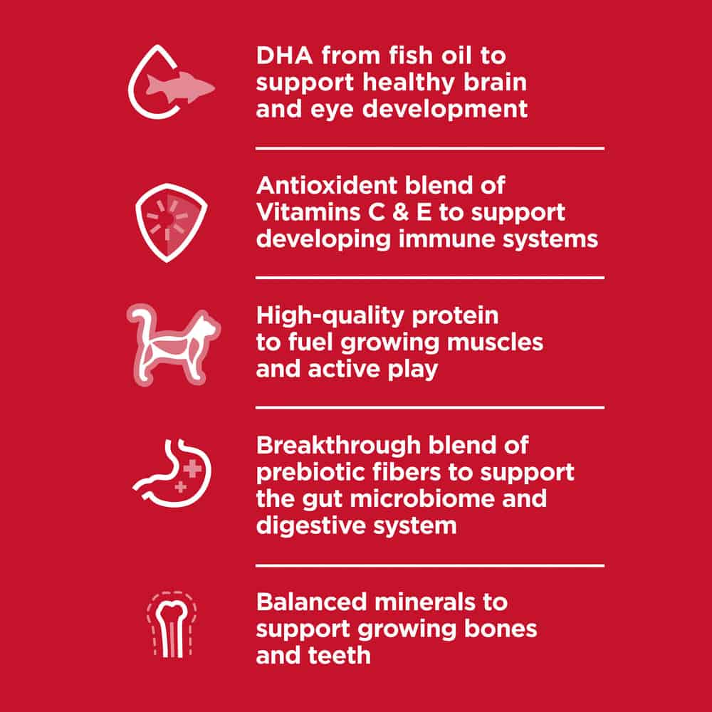 Hill's Science Diet Kitten dry food is specially formulated to fuel the energy needs of kittens, and support the developmental needs of kittens to help start life with healthy growth and a strong immune system.