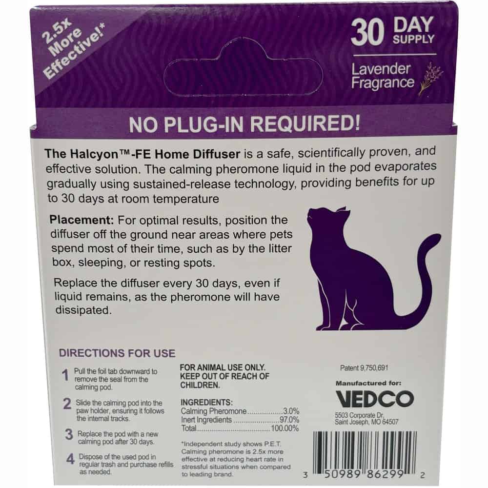 The Halcyon-Fe Calming Diffuser uses a special blend of scents, including lavender, that are designed to calm anxious cats. When smelled by cats, this unique pheromone helps address separation anxiety, sound anxiety (loud noises), and travel stress, and can help reduce excessive meowing, marking, scratching, and aggression. Contains one calming pod and one pod holder. One pod lasts up to 30 days. Lavender fragrance. No plug-in needed.