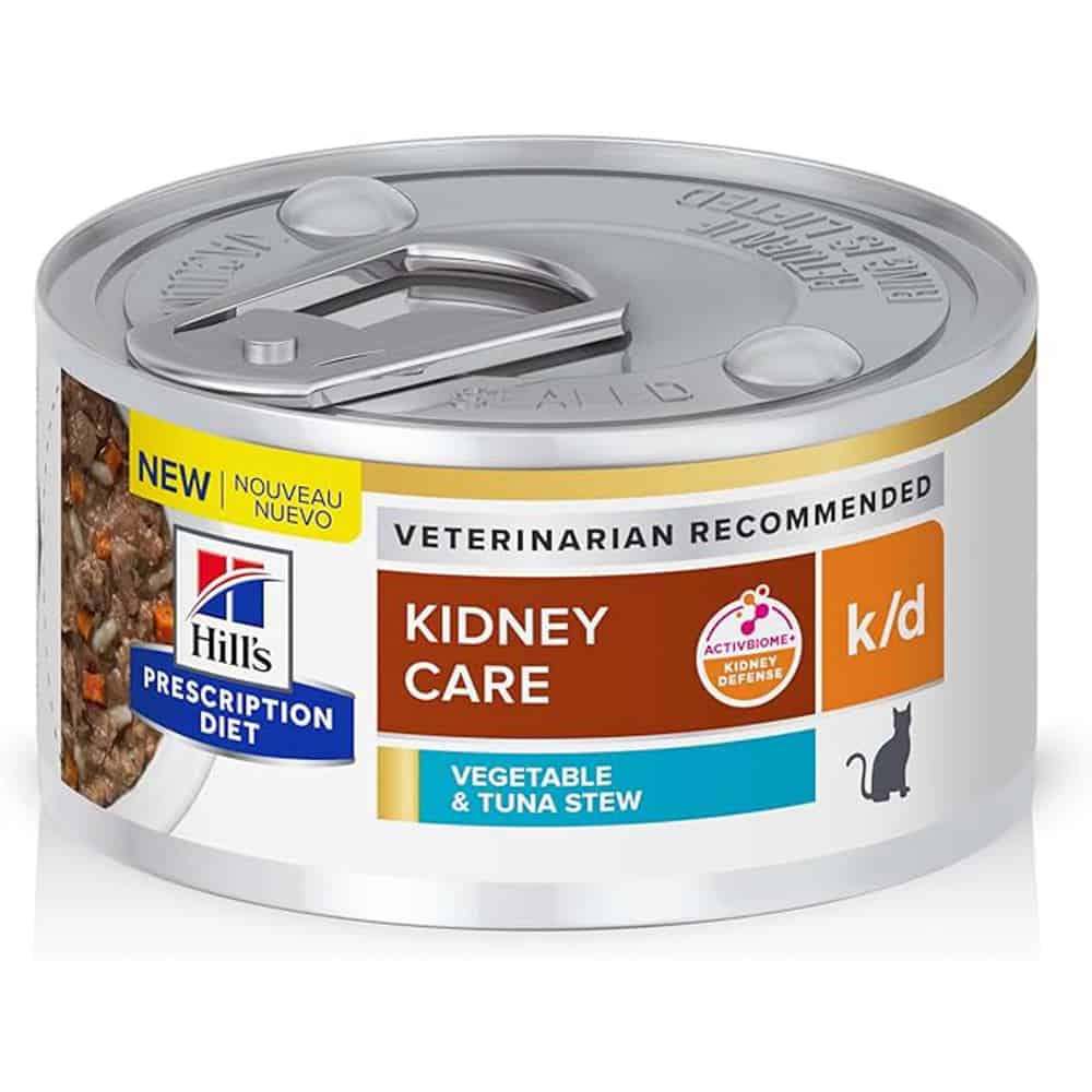 - Hill's Prescription Diet k/d Kidney Care Vegetable & Tuna Stew Wet Cat Food is specially formulated by Hill’s nutritionists and veterinarians to help protect your cat's vital kidney function.