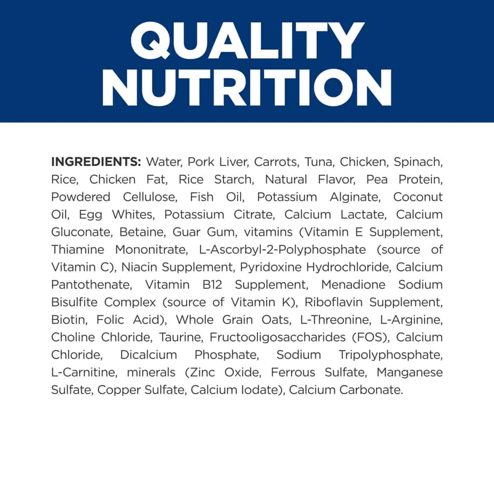 | Water, Pork Liver, Carrots, Tuna, Chicken, Spinach, Rice, Chicken Fat, Rice Starch, Natural Flavor, Pea Protein, Powdered Cellulose, Fish Oil, Potassium Alginate, Coconut Oil, Egg Whites, Potassium Citrate, Calcium Lactate, Calcium Gluconate, Betaine, Guar Gum, vitamins (Vitamin E Supplement, Thiamine Mononitrate, L-Ascorbyl-2-Polyphosphate (source of Vitamin C), Niacin Supplement, Pyridoxine Hydrochloride, Calcium Pantothenate, Vitamin B12 Supplement, Menadione Sodium Bisulfite Complex (source of Vitamin K), Riboflavin Supplement, Biotin, Folic Acid), Whole Grain Oats, L-Threonine, L-Arginine, Choline Chloride, Taurine, Fructooligosaccharides (FOS), Calcium Chloride, Dicalcium Phosphate, Sodium Tripolyphosphate, L-Carnitine, minerals (Zinc Oxide, Ferrous Sulfate, Manganese Sulfate, Copper Sulfate, Calcium Iodate), Calcium Carbonate. |