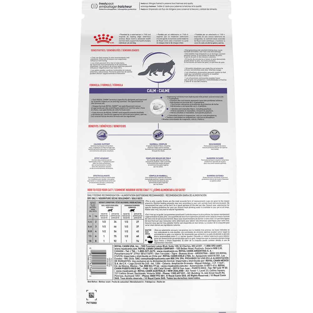 Royal Canin Feline Calm is a veterinary-exclusive dry cat food specially formulated to help provide calming nutrients for cats facing stressful environments or situations. This includes calming support for digestive upsets, skin irritations, and urinary sensitivities.
