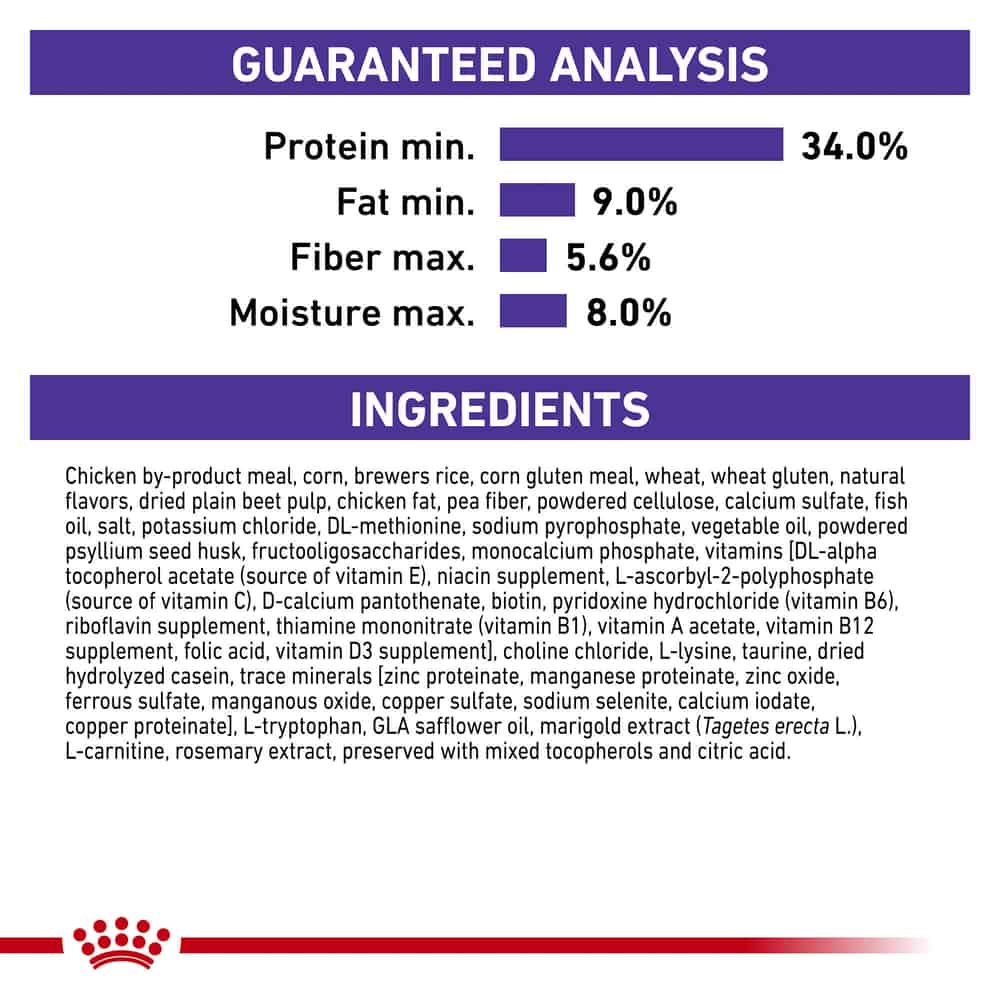 | Chicken by-product meal, corn, brewers rice, corn gluten meal, wheat, wheat gluten, natural flavors, dried plain beet pulp, chicken fat, pea fiber, powdered cellulose, calcium sulfate, fish oil, salt, potassium chloride, DL-methionine, sodium pyrophosphate, vegetable oil, powdered psyllium seed husk, fructooligosaccharides, monocalcium phosphate, vitamins[DL-alpha tocopherol acetate (source of vitamin E), niacin supplement, L-ascorbyl-2-polyphosphate (source of vitamin C), D-calcium pantothenate, biotin, pyridoxine hydrochloride (vitamin B6), riboflavin supplement, thiamine mononitrate (vitamin B1), vitamin A acetate, vitamin B12 supplement, folic acid, vitamin D3 supplement], choline chloride, L-lysine, taurine, dried hydrolyzed casein, trace minerals[zinc proteinate, manganese proteinate, zinc oxide, ferrous sulfate, manganous oxide, copper sulfate, sodium selenite, calcium iodate, copper proteinate], L-tryptophan, GLA safflower oil, marigold extract (Tagetes erecta L.), L-carnitine, rosemary extract, preserved with mixed tocopherols and citric acid. |