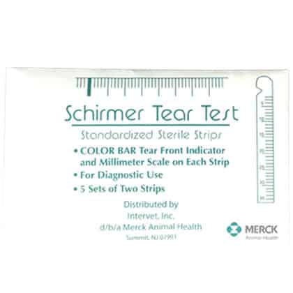 The Schirmer Tear Test (STT) is used to measure the rate of tear production in animals. It can be used to diagnose tear deficiency as a contributing factor to ocular (eye) surface diseases, such as Keratoconjunctivitis sicca (KCS), pigmentary keratitis, indolent corneal ulcers, exposure keratitis, and more. It can also be used to assess lacrimal gland function before cataract surgery. Each standardized sterile strip has a color bar tear front indicator and a millimeter scale (up to 35 mm). One package of Schirmer Tear Test contains 5 sets of two strips (one for the left eye and one for the right eye).