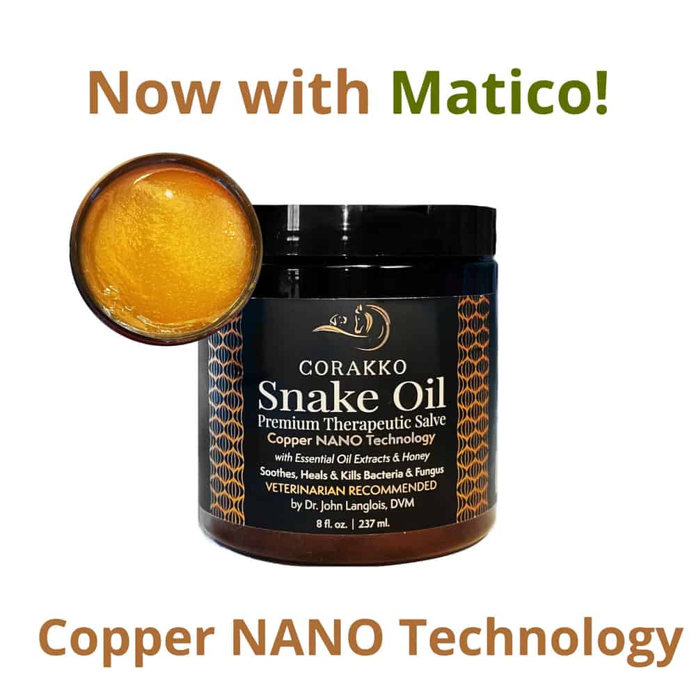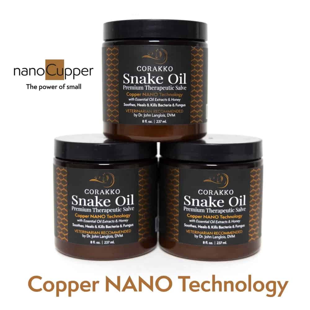 Corakko Snake Oil is a therapeutic topical treatment designed to soothe, heal, and eliminate bacteria and fungi on and beneath the skin. Utilizing advanced copper nano technology combined with essential oil extracts and honey, this formulation effectively addresses various skin conditions, including wounds, hotspots, rain rot, scratches, insect bites, cracked hooves, and summer sores.