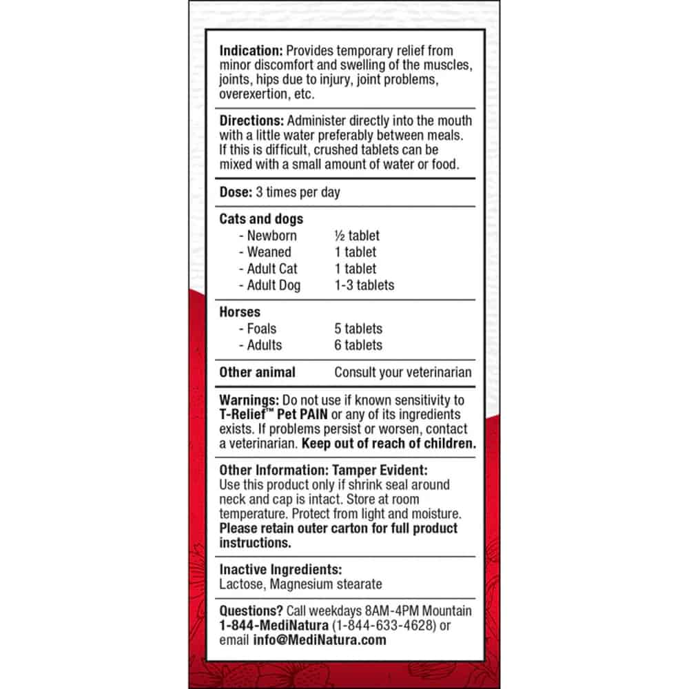 • T-Relief Pet Pain Tablets for Dogs, Cats, and Horses are formulated from natural plant and mineral ingredients.