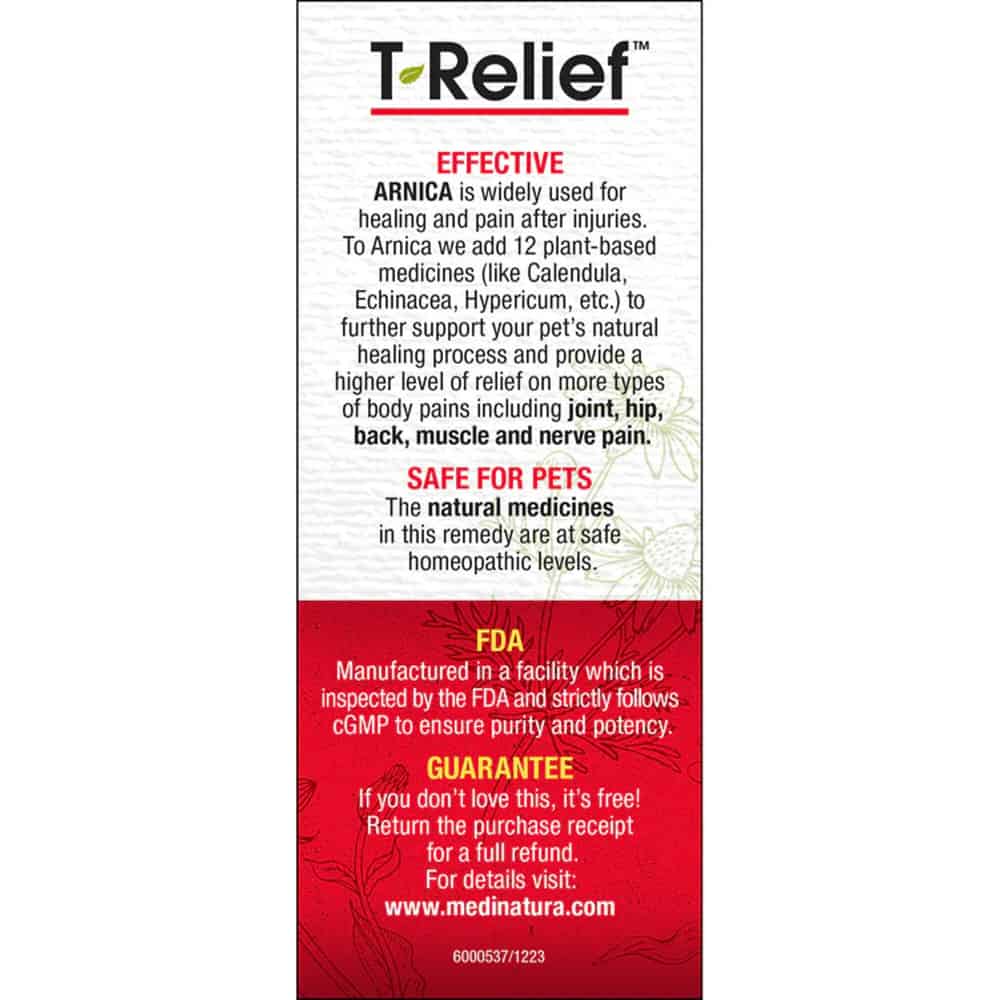 T-Relief Pet Pain is a. P natural and homeopathic remedy specifically designed for pets to alleviate pain and promote healinghysicians often recommend T-Relief as a safe and reliable alternative to NSAIDs.
