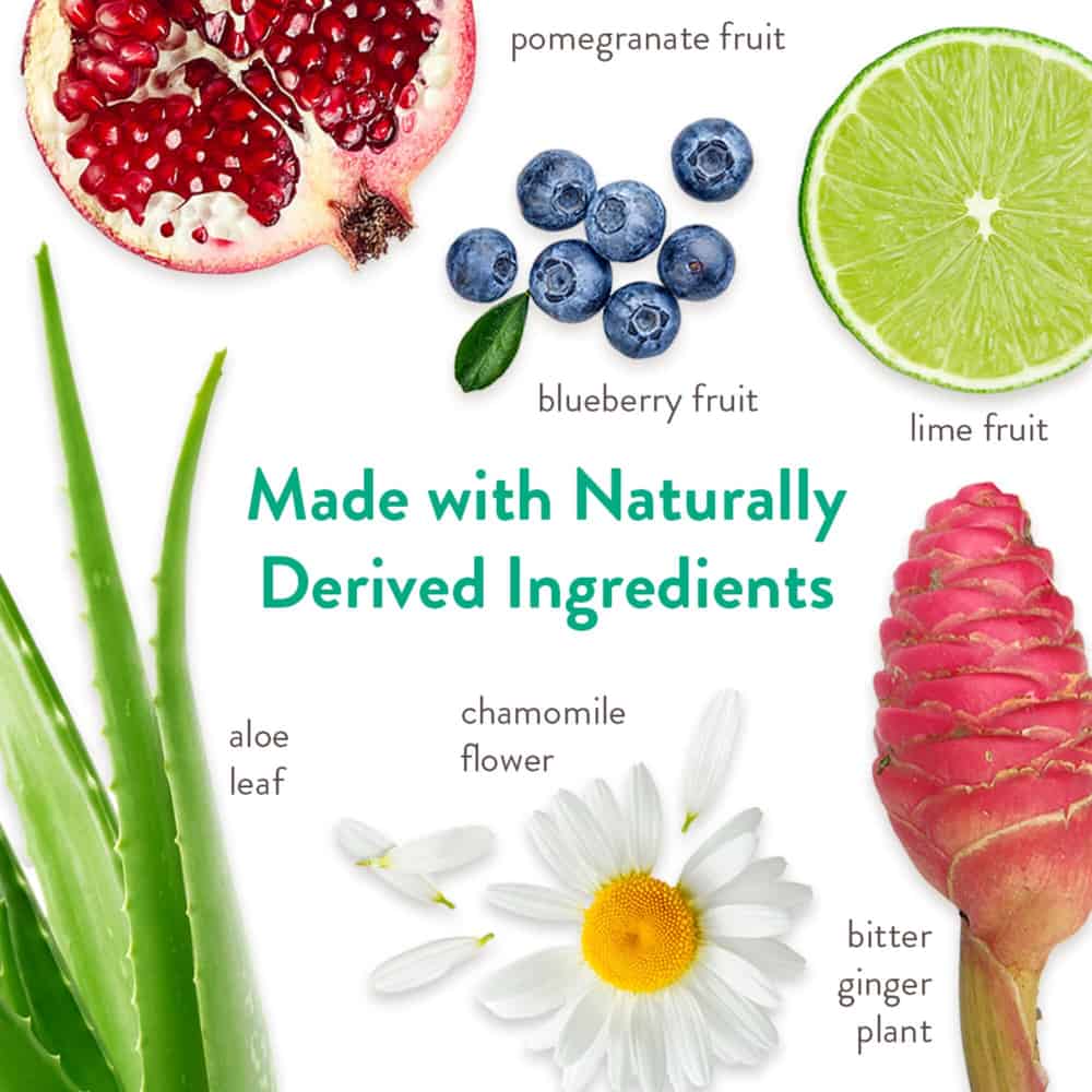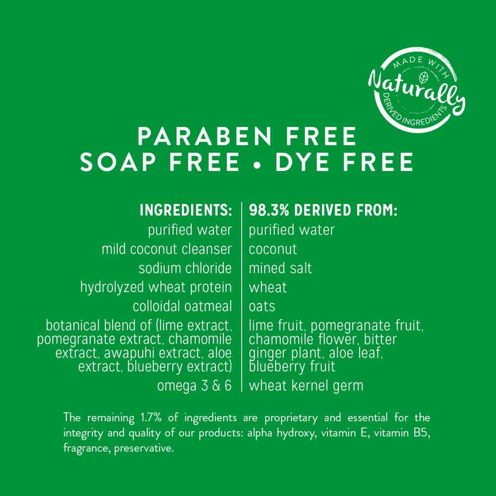 | Purified Water, Mild Coconut Cleanser, Sodium Chloride, Hydrolyzed Wheat Protein, Colloidal Oatmeal, Botanical Blend Of (Lime Extract, Pomegranate Extract, Chamomile Extract, Awapuhi Extract, Aloe Extract, Blueberry Extract), Omega 3 & 6, Alpha Hydroxy, Vitamin E, Vitamin B5, Fragrance, Preservative. |