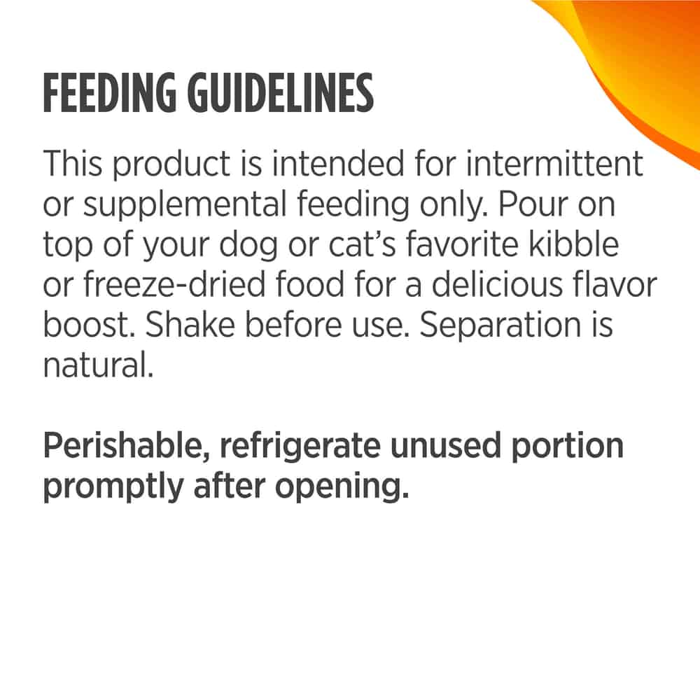 - This product is intended for intermittent or supplemental feeding only. Pour on top of your dog or cat’s favorite kibble or freeze-dried food for a delicious flavor boost.
