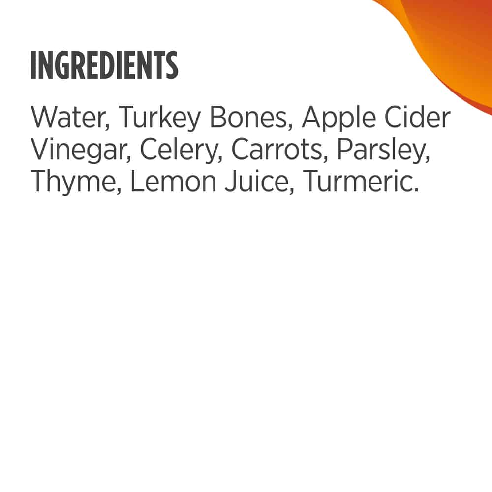 | Other Ingredients: Water, Turkey Bones, Apple Cider Vinegar, Celery, Carrots, Parsley, Thyme, Lemon Juice, Turmeric. |