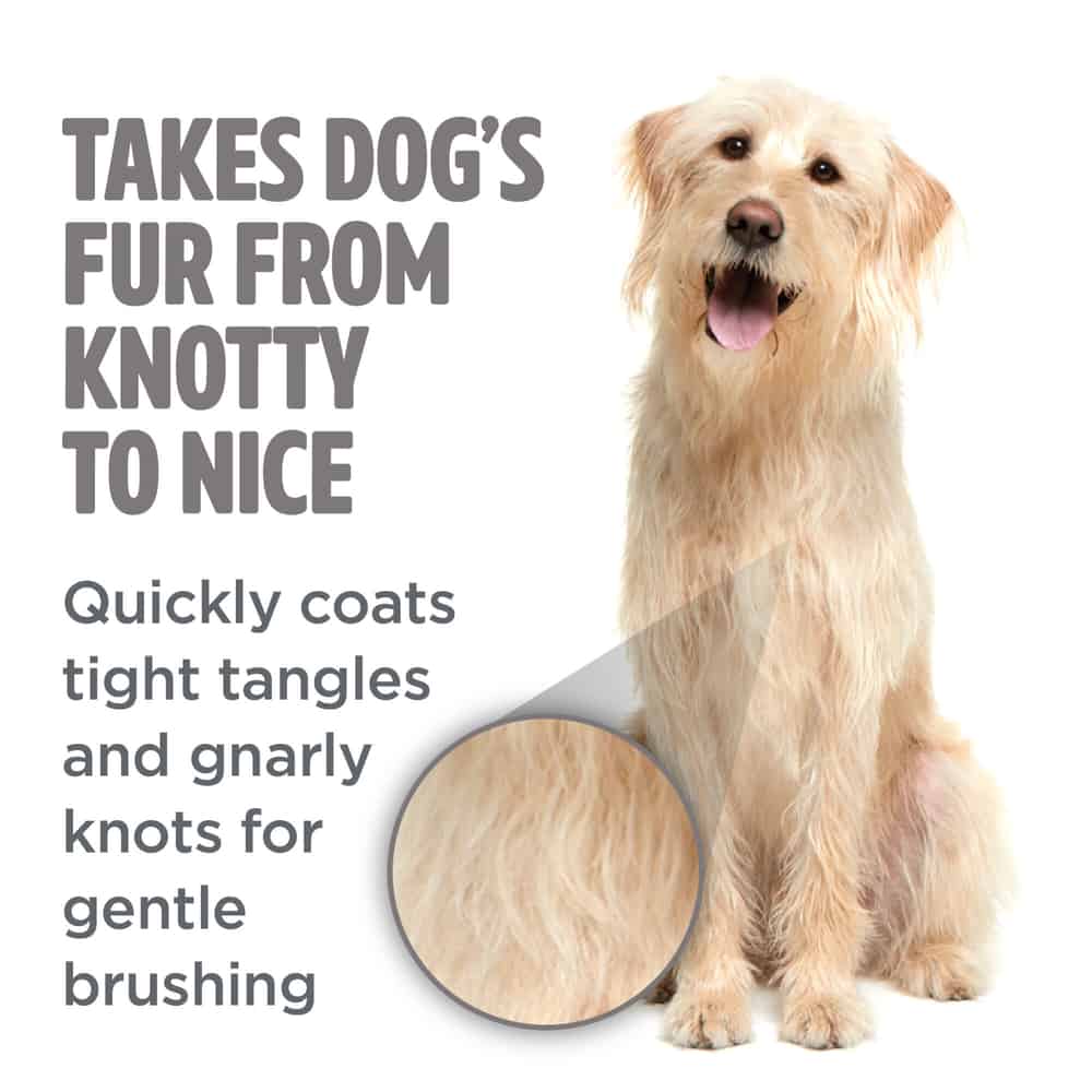 Detangler that takes dogs’ fur from knotty to nice. Quickly coats tight tangles and gnarly knots for gentle brushing. No-rinse formula helps restore and retain moisture while helping make frizz and static obedient and well-behaved
