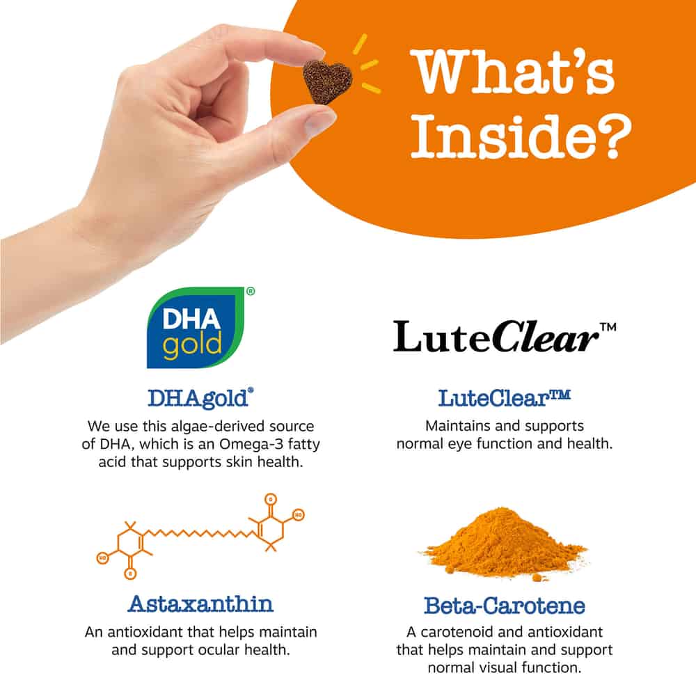 | Cod Liver Oil, Schizochytrium sp. Algae (DHAgold®), Vitamin C (Ascorbic Acid), Lutein (LuteClear™), Vitamin E (D-Alpha Tocopherol), Astaxanthin, Beta-Carotene, Zeaxanthin Isomers (LuteClear™). |
