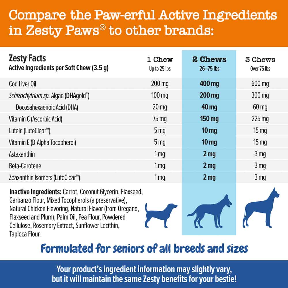 - Zesty Paws Senior Vision Bites are chewable supplements with antioxidants (Vitamins C & E), and Omega-3 to promote eye health for senior dogs of any breed or size.