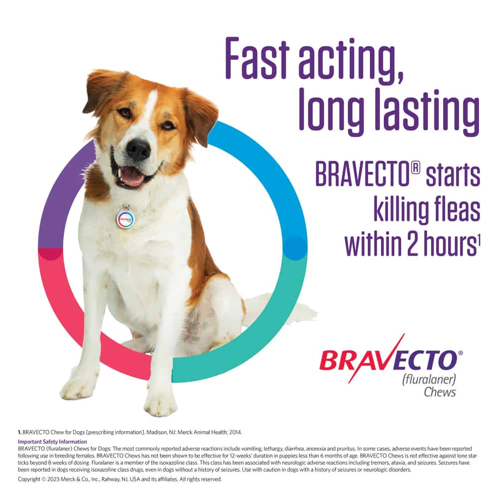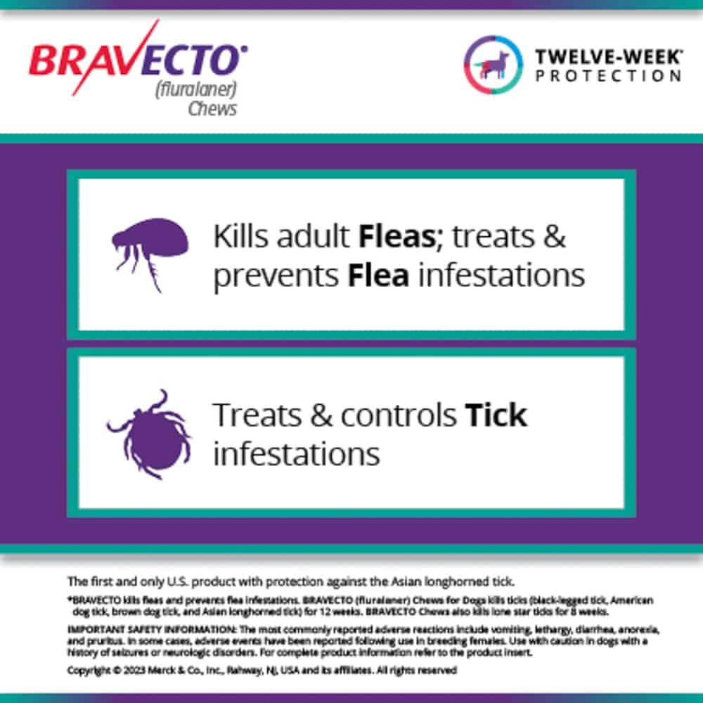 BRAVECTO (fluralaner) Chews for dogs is the #1 longest-lasting chew for powerful flea and tick protection. Easy and convenient to administer, just one dose of vet-recommended and FDA-approved BRAVECTO starts killing fleas and ticks within hours, prevents flea infestations, kills ticks (black-legged tick, American dog tick, brown dog tick and Asian longhorned tick) for 12 weeks and kills lone star ticks for 8 weeks. Discover BRAVECTO (fluralaner topical solution) for dogs and cats. Available by prescription only. Proudly sourced directly from the manufacturer or their approved distributor. Guaranteed genuine and backed by the manufacturer.