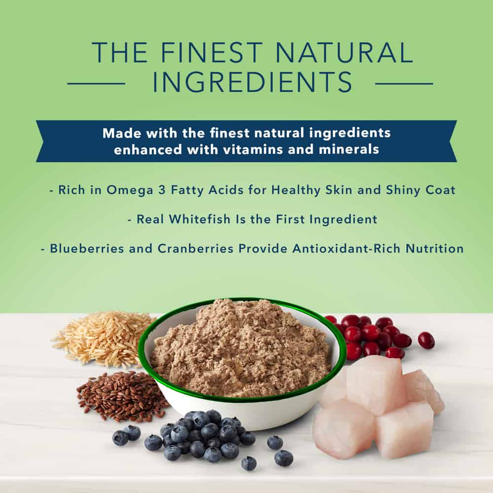 - Real Whitefish (source of Omega 3 and 6 Fatty Acids) First Ingredient