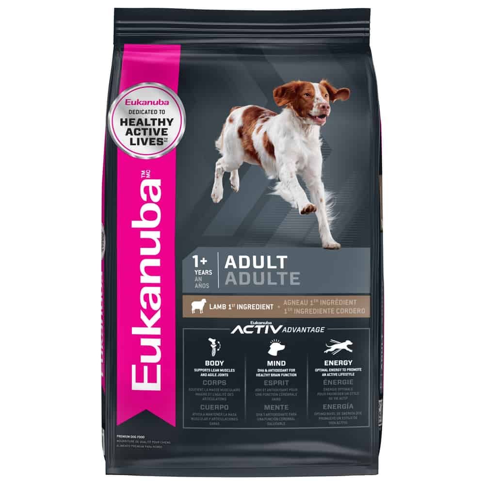 Animal proteins, glucosamine, and chondroitin sulfate help keep muscles lean and joints limber and strong. DHA and vitamin E help support healthy brain function to help your dog stay sharp. Optimal levels of fats and carbohydrates help fuel an active lifestyle. 3D DentaDefense reduces tartar buildup for clean teeth and healthy gums. And a natural fiber and prebiotic blend aids gentle digestion to help keep your dog feeling healthy. And high-quality lamb is the first ingredient to power your active dog’s day. Pair this kibble with Eukanuba Adult wet dog food for the perfect complement.
