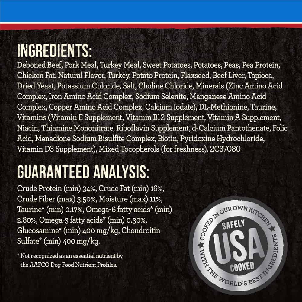 | Ingredients: Deboned Beef, Pork Meal, Turkey Meal, Sweet Potatoes, Potatoes, Peas, Potato Protein, Salmon Meal, Chicken Fat, Pea Protein, Natural Flavor, Turkey, Lamb, Sunflower Oil, Beef Liver, Salt, Organic Dehydrated Alfalfa Meal, Potassium Chloride, Choline Chloride, Apples, Blueberries, Minerals (Iron Amino Acid Complex, Zinc Amino Acid Complex, Zinc Sulfate, Sodium Selenite, Manganese Amino Acid Complex, Copper Amino Acid Complex, Copper Sulfate, Potassium Iodide, Cobalt Proteinate, Cobalt Carbonate), Taurine, Yucca Schidigera Extract, Mixed Tocopherols for freshness, Vitamins (Vitamin E Supplement, Vitamin B12 Supplement, Vitamin A Acetate, d-Calcium Pantothenate, Thiamine Mononitrate, Niacin, Riboflavin Supplement, Biotin, Vitamin D3 Supplement, Folic Acid, Pyridoxine Hydrochloride), Citric Acid for freshness, Dried Lactobacillus plantarum Fermentation Product, Dried Lactobacillus casei Fermentation Product, Dried Enterococcus faecium Fermentation Product, Dried Lactobacillus acidophilus Fermentation product |