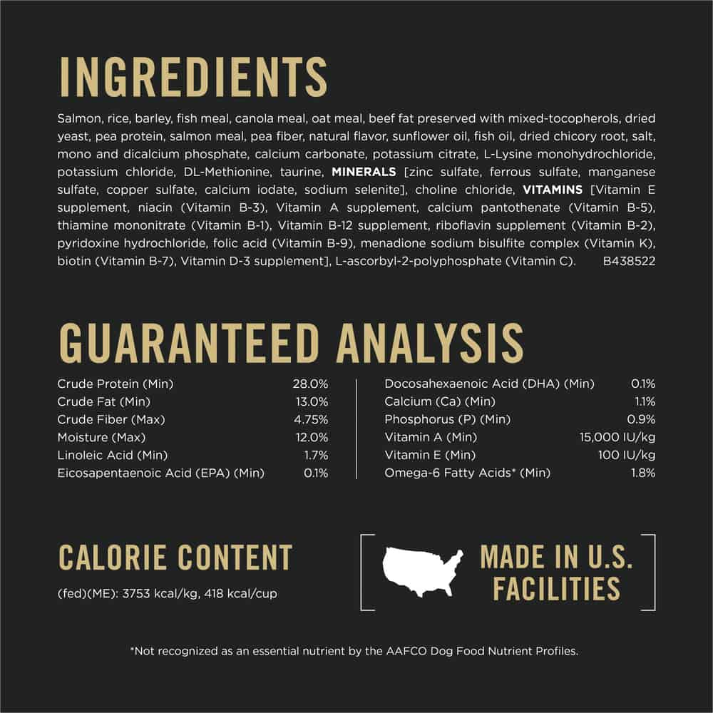 | Salmon, Rice, Barley, Fish Meal, Canola Meal, Oat Meal, Dried Yeast, Pea Protein, Beef Fat Preserved With Mixed-Tocopherols, Salmon Meal, Natural Flavor, Pea Fiber, Chicory Root Inulin, Sunflower Oil, Calcium Carbonate, Salt, Fish Oil, L-Lysine Monohydrochloride, Mono And Dicalcium Phosphate, Potassium Citrate, Taurine, DL-Methionine, MINERALS [Zinc Sulfate, Ferrous Sulfate, Manganese Sulfate, Copper Sulfate, Calcium Iodate, Sodium Selenite], Potassium Chloride, Choline Chloride, VITAMINS [Vitamin E Supplement, Niacin (Vitamin B-3), Vitamin A Supplement, Calcium Pantothenate (Vitamin B-5), Thiamine Mononitrate (Vitamin B-1), Vitamin B-12 Supplement, Riboflavin Supplement (Vitamin B-2), Pyridoxine Hydrochloride (Vitamin B-6), Folic Acid (Vitamin B-9), Menadione Sodium Bisulfite Complex (Vitamin K), Biotin (Vitamin B-7), Vitamin D-3 Supplement], L-Ascorbyl-2-Polyphosphate (Vitamin C), Dried Bacillus Coagulans Fermentation Product. A438520 |