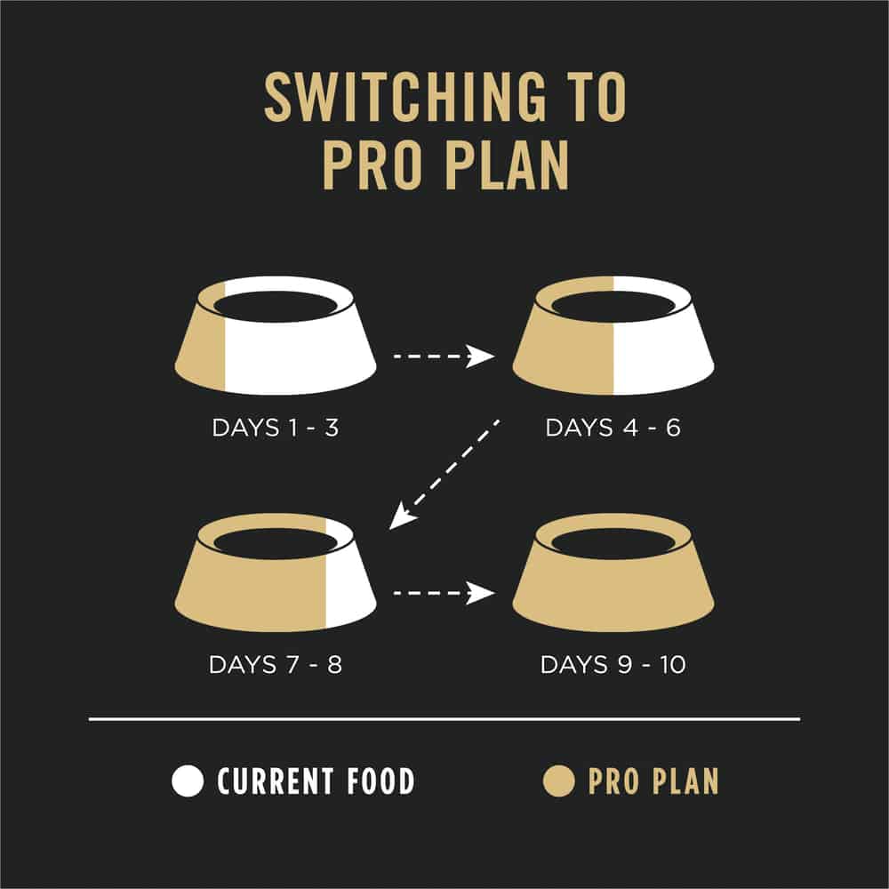 - Although you'll be anxious to see the difference Pro Plan can make in your dogs please allow 7-10 days to ease the transition from your dog's current food. Each day, simply feed a little less of the previous food and a little more Pro Plan until you're feeding Pro Plan exclusively.