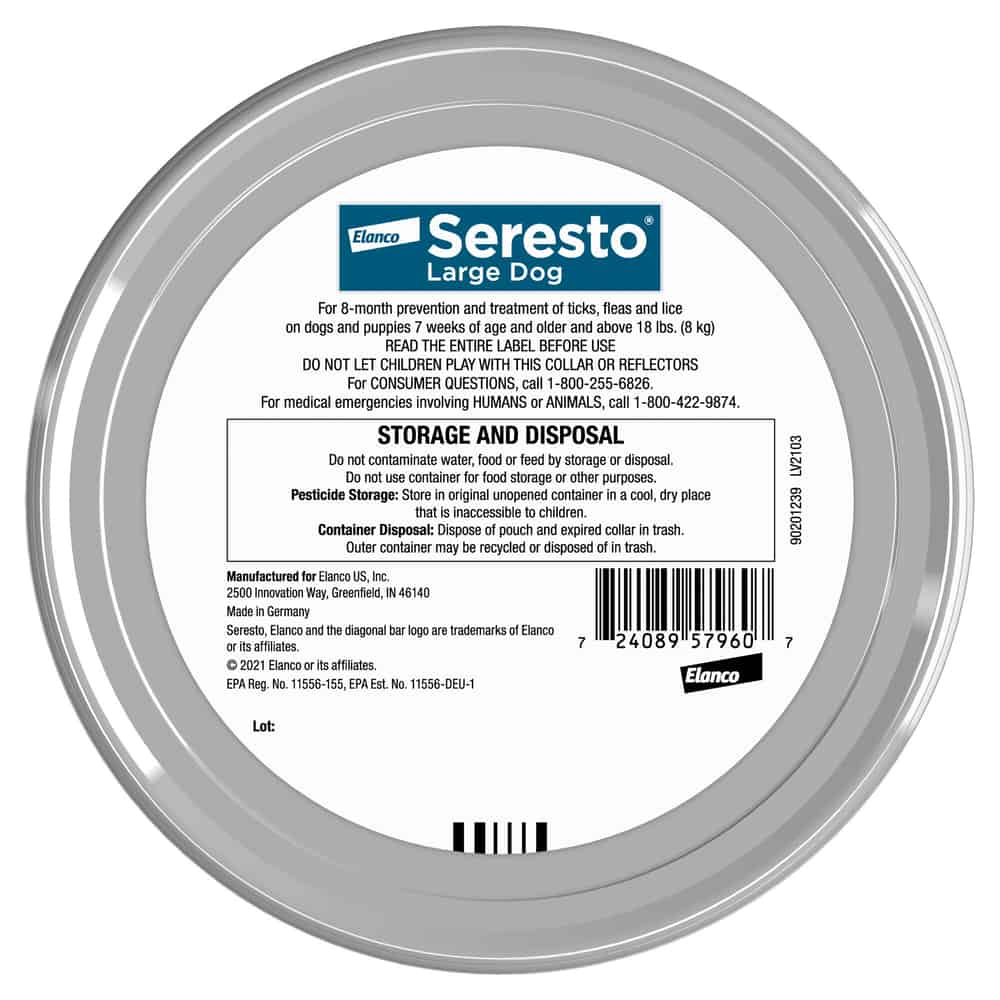 Seresto Large Dog collars make your dog’s comfort a priority by killing fleas and ticks on contact, so pests don’t have to bite your dog to die. Existing fleas die within 24 hours after initial application of the collar. After 24 hours, any new fleas on the dog are killed within 2 hours with protection against further flea infestation lasting 8 months. The prevention of infestations with new ticks starts at 48 hours after application of the collar. 48 hours after application, any new ticks are repelled and/or killed in as quickly as 6 hours. Seresto Large Dog collars protect against common pests like deer ticks, American dog ticks, brown dog ticks, and Lone Star ticks; they’re also effective against chewing lice. Fleas and ticks not only cause discomfort; fleas can transmit bartonellosis or tapeworm. Ticks can transmit Borrelia burgdorferi which causes Lyme Disease. Check the product label for information on potential side effects.