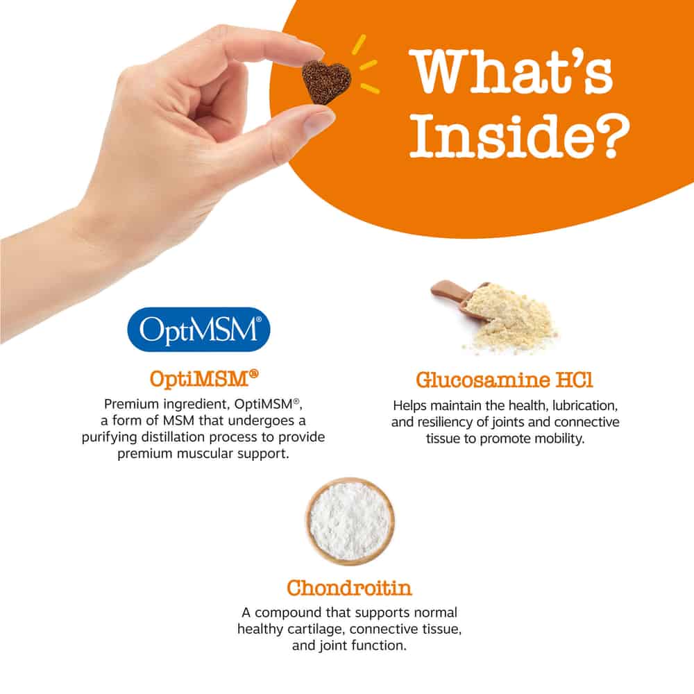 These chewables feature Glucosamine HCl, Chondroitin Sulfate, and Yucca Extract to help cushion joints, promote healthy cartilage, and support proper hip function, as well as OptiMSM®, a GRAS-designed form of MSM that may provide support for cushioning and joint stress recovery time.