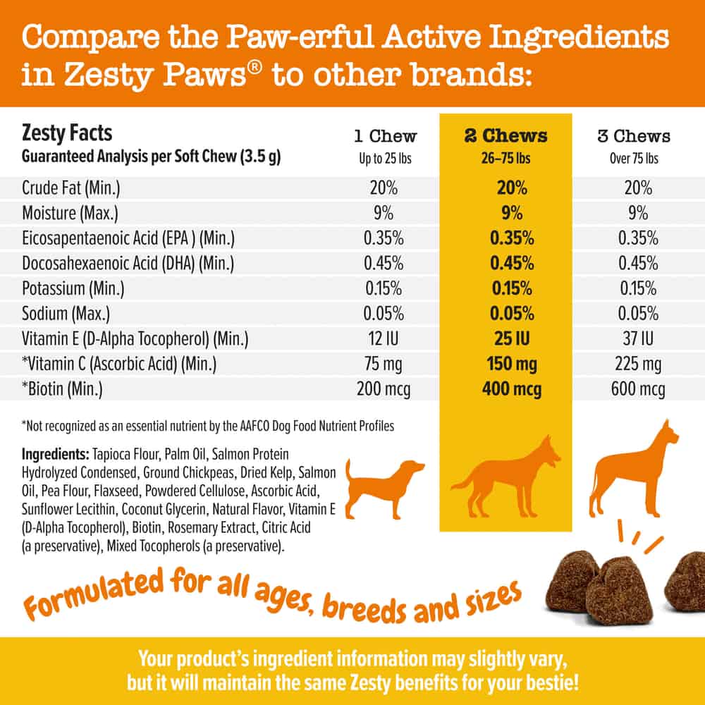 Zesty Paws Salmon Bites Salmon Flavored Soft Chews Skin & Coat Supplement for Dogs Directions: