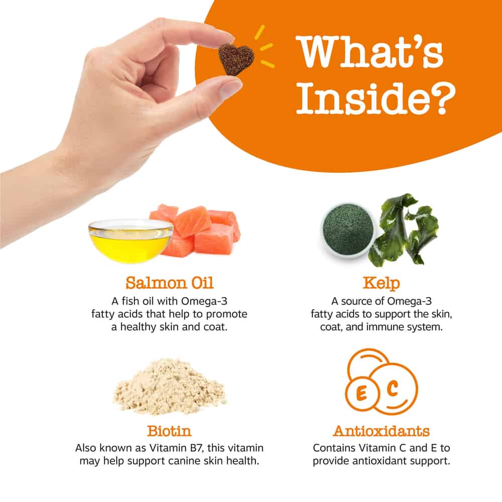 - Treat your pet to pawsome ingredients like Kelp and Biotin (Vitamin B7), which work together with the fatty acid support of EPA and DHA omegas to support your pup's skin health even more.
