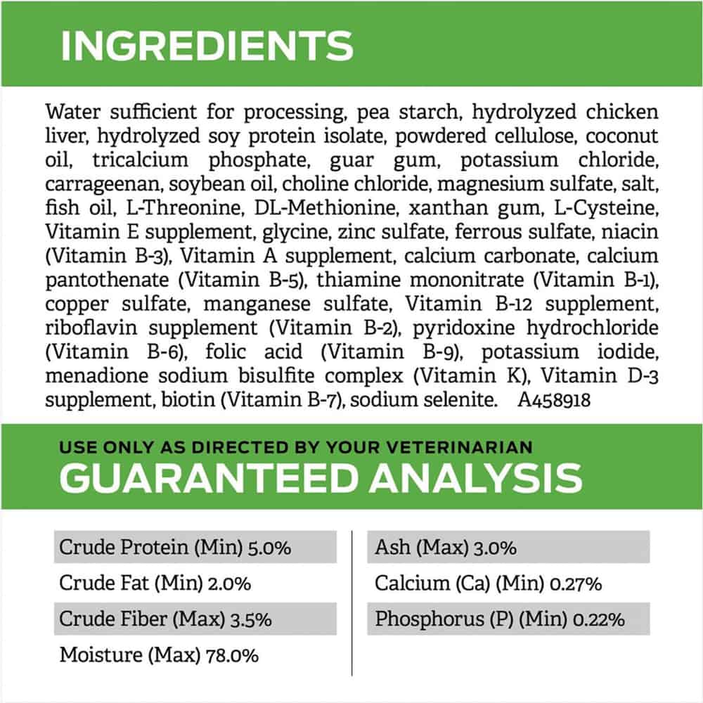 | Water Sufficient For Processing, Pea Starch, Hydrolyzed Chicken Liver, Hydrolyzed Soy Protein Isolate, Powdered Cellulose, Coconut Oil, Tricalcium Phosphate, Guar Gum, Potassium Chloride, Carrageenan, Soybean Oil, Choline Chloride, Magnesium Sulfate, Salt, Fish Oil, L-Threonine, Dl-Methionine, Xanthan Gum, L-Cysteine, Vitamin E Supplement, Glycine, Zinc Sulfate, Ferrous Sulfate, Niacin (Vitamin B-3), Vitamin A Supplement, Calcium Carbonate, Calcium Pantothenate (Vitamin B-5), Thiamine Mononitrate (Vitamin B-1), Copper Sulfate, Manganese Sulfate, Vitamin B-12 Supplement, Riboflavin Supplement (Vitamin B-2), Pyridoxine Hydrochloride (Vitamin B-6), Folic Acid (Vitamin B-9), Potassium Iodide, Menadione Sodium Bisulfite Complex (Vitamin K), Vitamin D-3 Supplement, Biotin (Vitamin B-7), Sodium Selenite. A458918 |