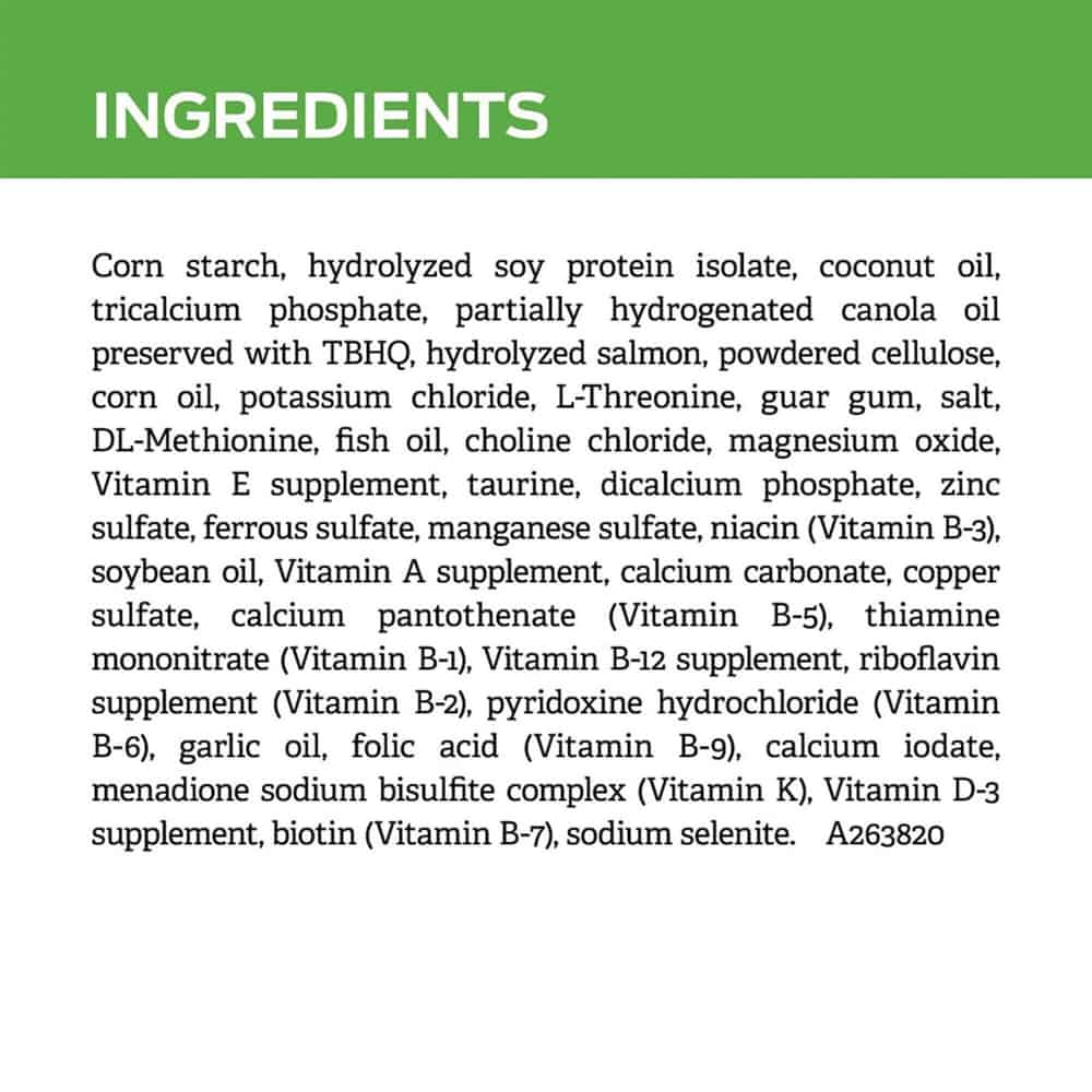 | Corn Starch, Hydrolyzed Soy Protein Isolate, Coconut Oil, Tricalcium Phosphate, Partially Hydrogenated Canola Oil Preserved With Tbhq, Hydrolyzed Salmon, Powdered Cellulose, Corn Oil, Potassium Chloride, L-threonine, Guar Gum, Salt, Dl-methionine, Fish Oil, Choline Chloride, Magnesium Oxide, Vitamin E Supplement, Taurine, Dicalcium Phosphate, Zinc Sulfate, Ferrous Sulfate, Manganese Sulfate, Niacin (Vitamin B-3), Soybean Oil, Vitamin A Supplement, Calcium Carbonate, Copper Sulfate, Calcium Pantothenate (Vitamin B-5), Thiamine Mononitrate (Vitamin B-1), Vitamin B-12 Supplement, Riboflavin Supplement (Vitamin B-2), Pyridoxine Hydrochloride (Vitamin B-6), Garlic Oil, Folic Acid (Vitamin B-9), Calcium Iodate, Menadione Sodium Bisulfite Complex (Vitamin K), Vitamin D-3 Supplement, Biotin (Vitamin B-7), Sodium Selenite. A263820 |