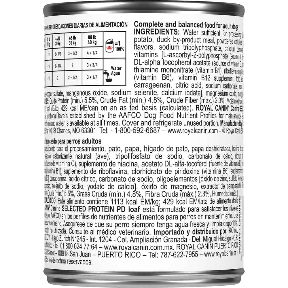 - MADE WITH POTATO & DUCK: Royal Canin Selected Protein Adult PD Wet Dog Food is a veterinary-exclusive diet made with potato, duck, and hydrolyzed soy for dogs with food sensitivities