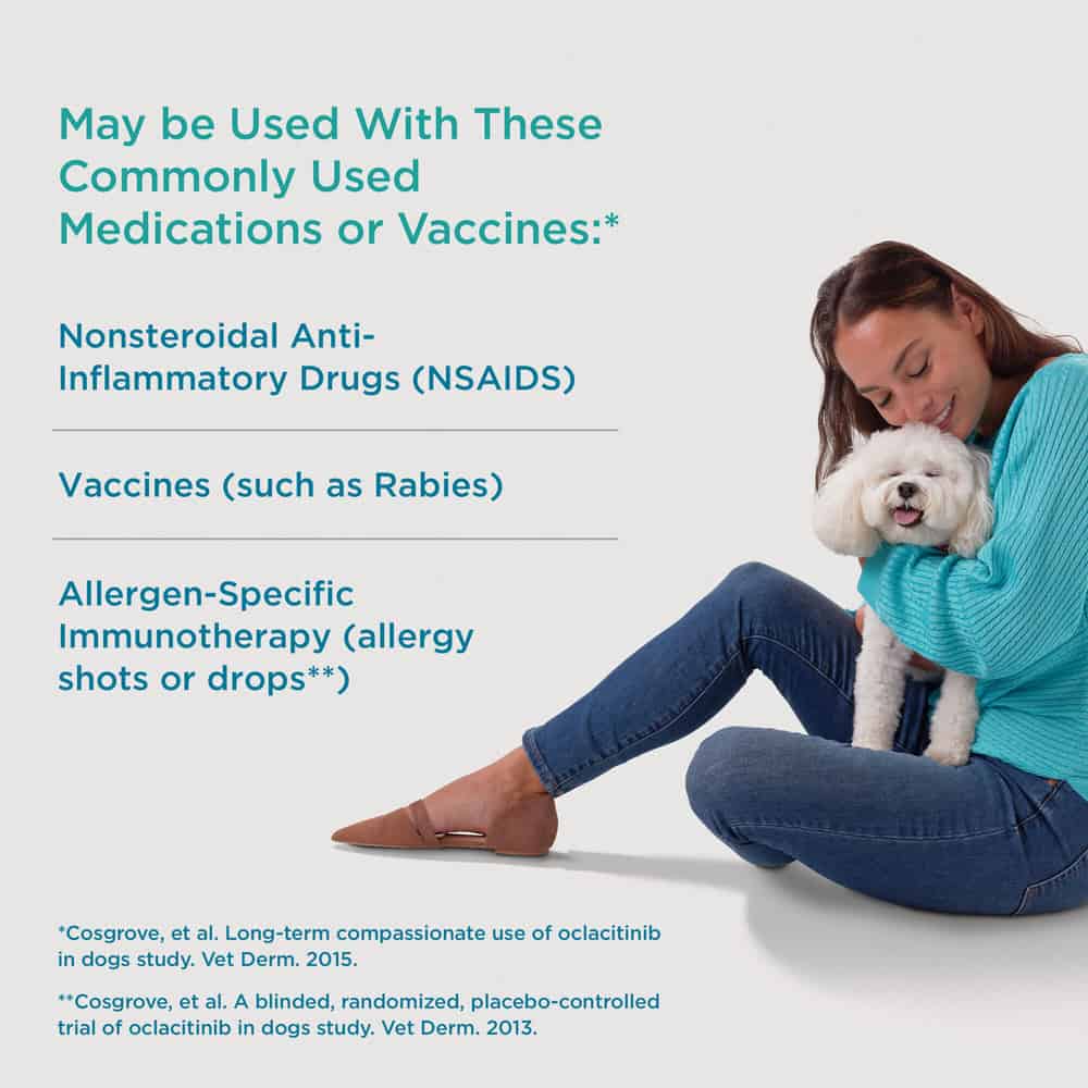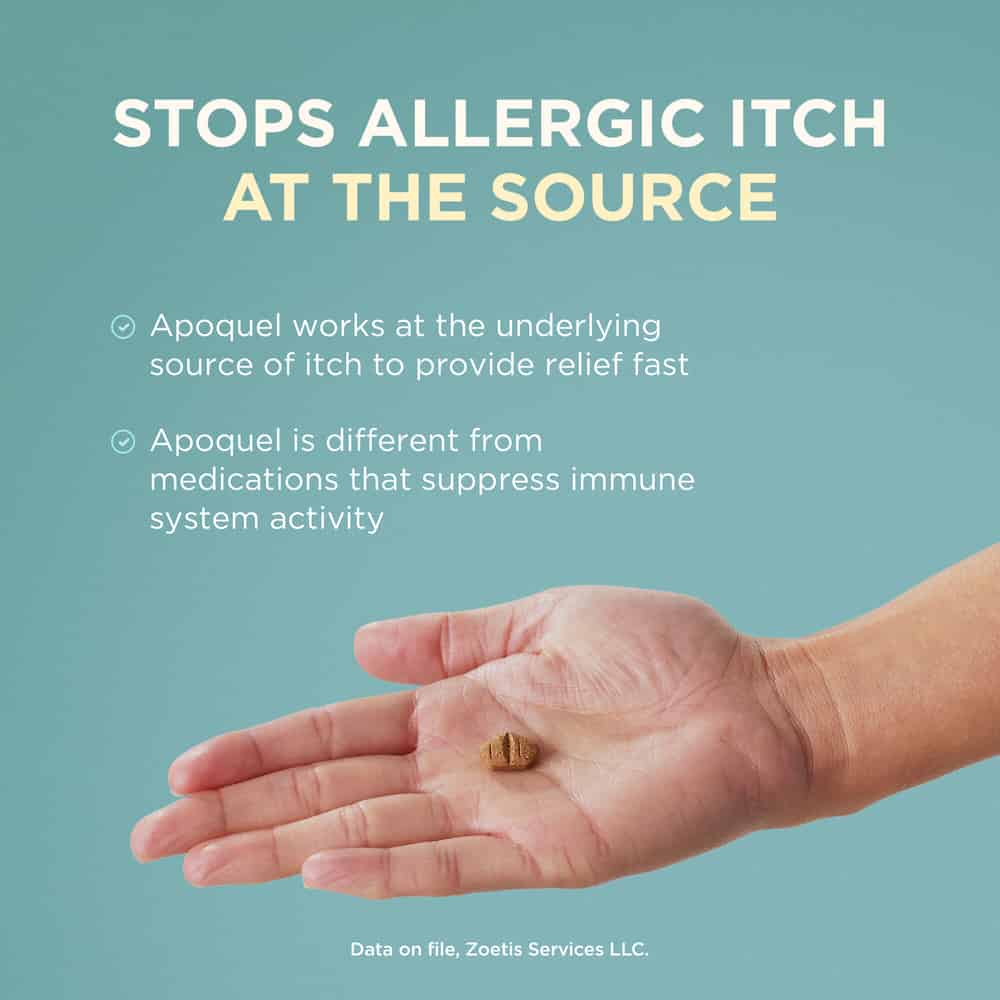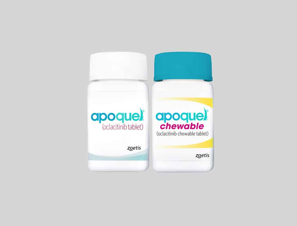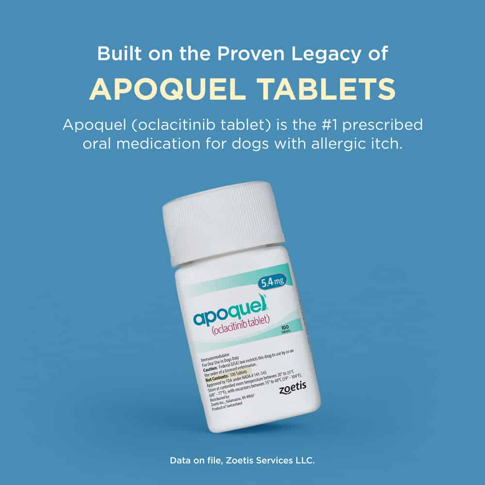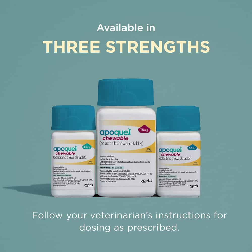 IMPORTANT SAFETY INFORMATION: Do not use Apoquel or Apoquel Chewable for Dogs in dogs less than 12 months of age or in dogs with skin infections. Apoquel Chewable for Dogs may increase the chances of developing serious infections, and may cause existing parasitic skin infestations or pre-existing cancers to get worse. Consider the risks and benefits of treatment in dogs with a history of recurrence of these conditions. Clinical studies and post-approval evaluations identified both benign and malignant neoplastic conditions. Apoquel Chewable for Dogss have not been evaluated for use alongside certain medications, including those frequently prescribed for skin conditions (like corticosteroids and cyclosporine.) Avoid using in dogs that are breeding, pregnant, or nursing. Common side effects include vomiting and diarrhea. Apoquel Chewable for Dogss can be used safely alongside many common medications such as including parasiticides, antibiotics, topical products for bacterial skin infections, and vaccines.