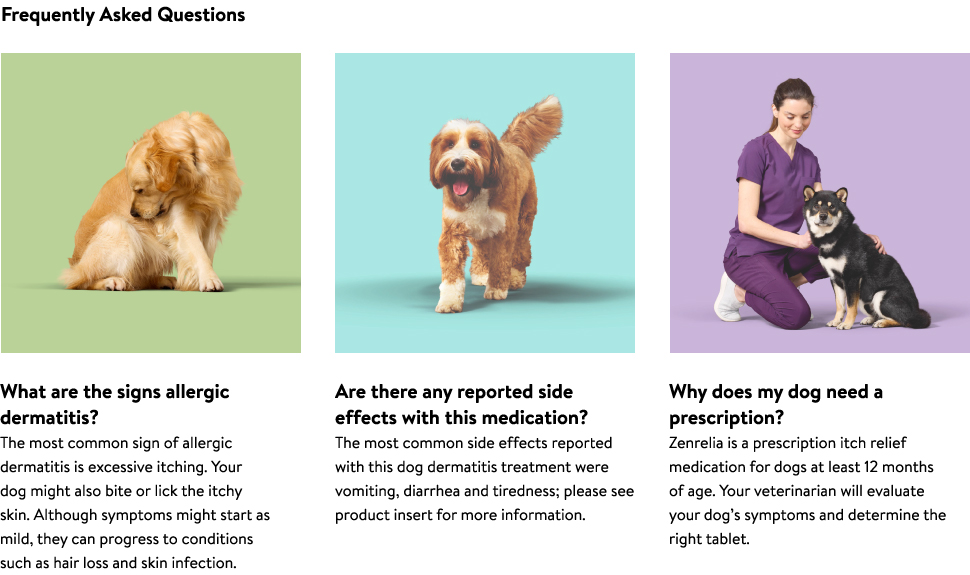 Zenrelia is an innovative, once-daily treatment that offers relief from itchy, irritated skin - right from the start. Allergic dermatitis can make your dog very uncomfortable. Symptoms like excessive itching, scratching, and biting aren't only disruptive to you and your pet, but they can also cause more severe problems over time, including hair loss and skin infection. Don’t let allergic itch disrupt your dog’s Zen. Reach for Zenrelia.