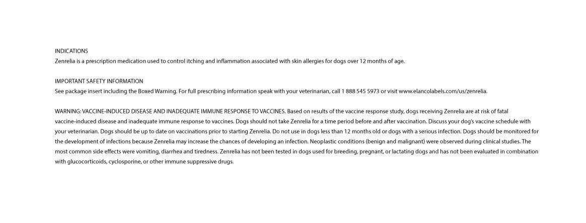 See package insert including the Boxed Warning. For full prescribing information speak with your veterinarian, call 1-888-545-5973 or visit www.elancolabels.com/us/zenrelia.