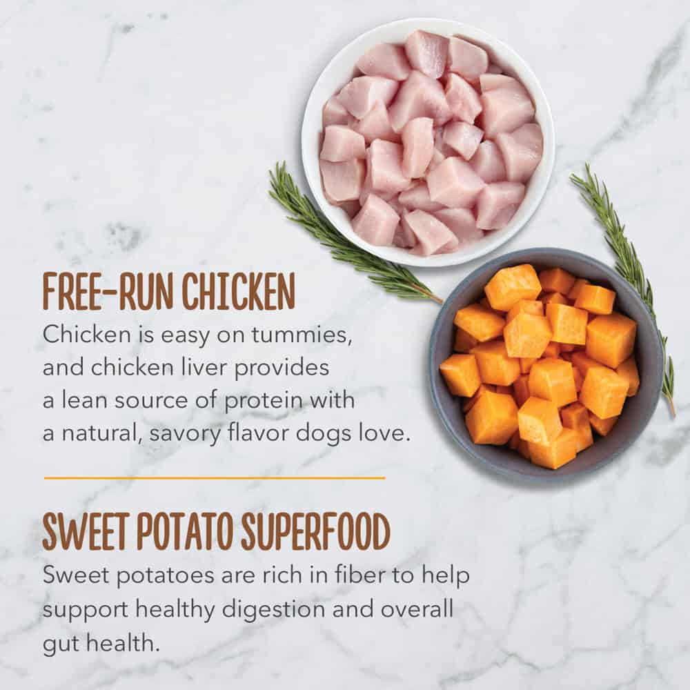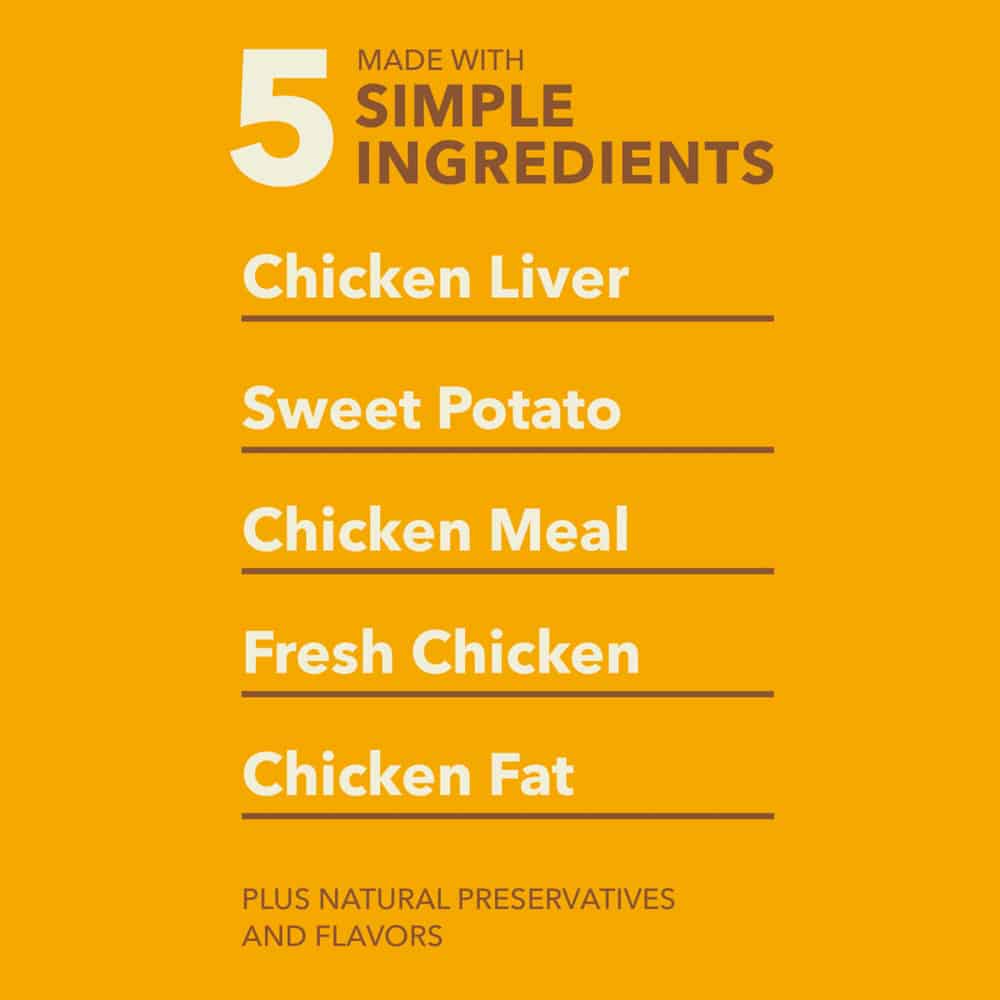 | Chicken liver, sweet potato, chicken meal, deboned chicken, natural flavor, chicken fat, mixed tocopherols (preservative), citric acid (preservative), rosemary extract |