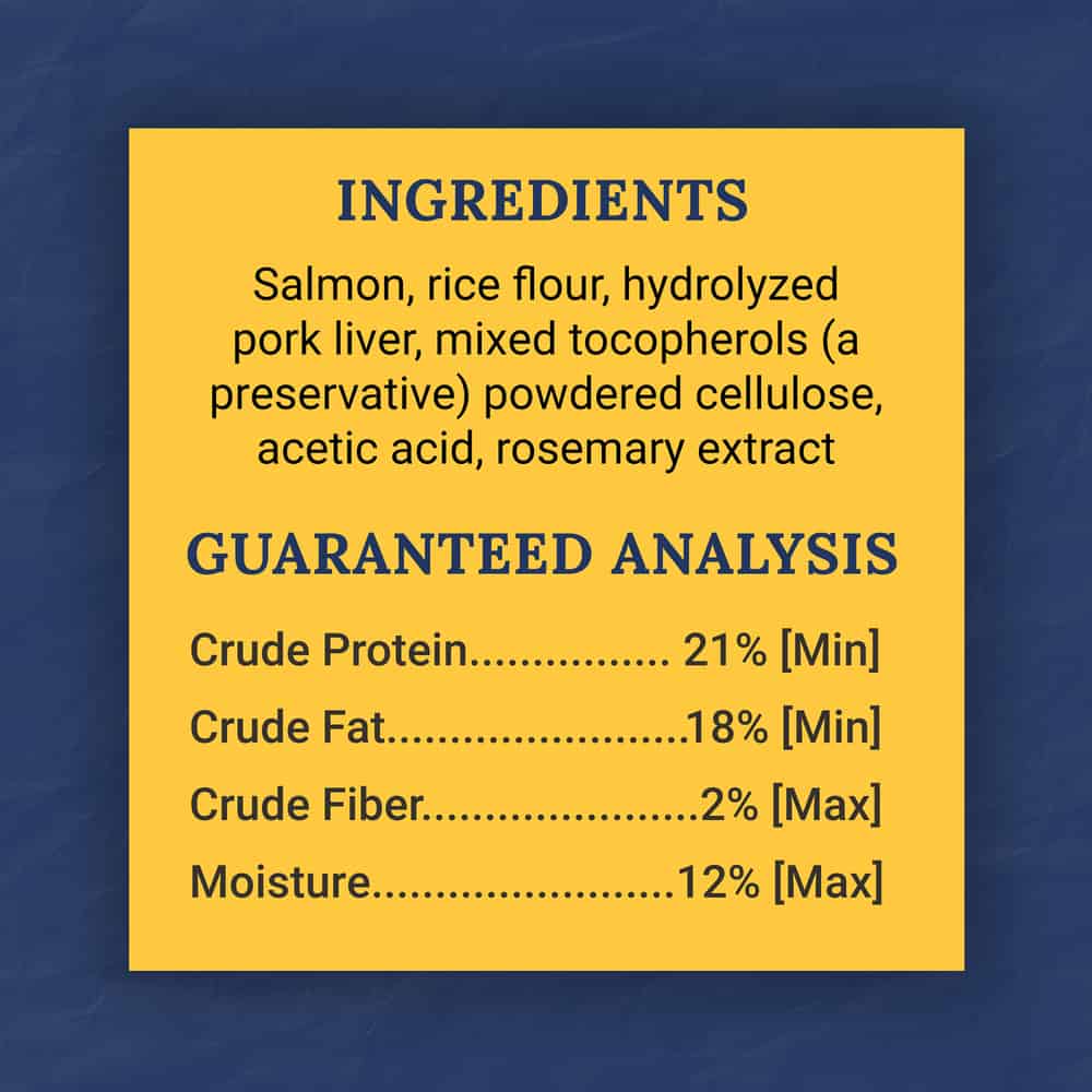 | Salmon, Rice flour, hydrolyzed pork liver, mixed tocopherols (a preservative) powdered cellulose, acetic acid, rosemary extract. |