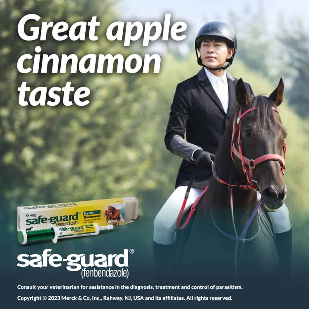 Safe-Guard Equine Paste Dewormer is an effective dewormer for horses. It controls large strongyles (Strongylus edentatus, S. equinus, S. vulgaris), encysted early third stage (hypobiotic), late third stage and fourth stage cyathostome larvae, small strongyles, pinworms (Oxyuris equi), ascarids (Parascaris equorum), and arteritis caused by fourth stage larvae of Strongylus vulgaris in horses. It's safe for foals and pregnant mares, older horses, thin and underweight horses, miniature horses, the environment and for use around other farm animals and pets.