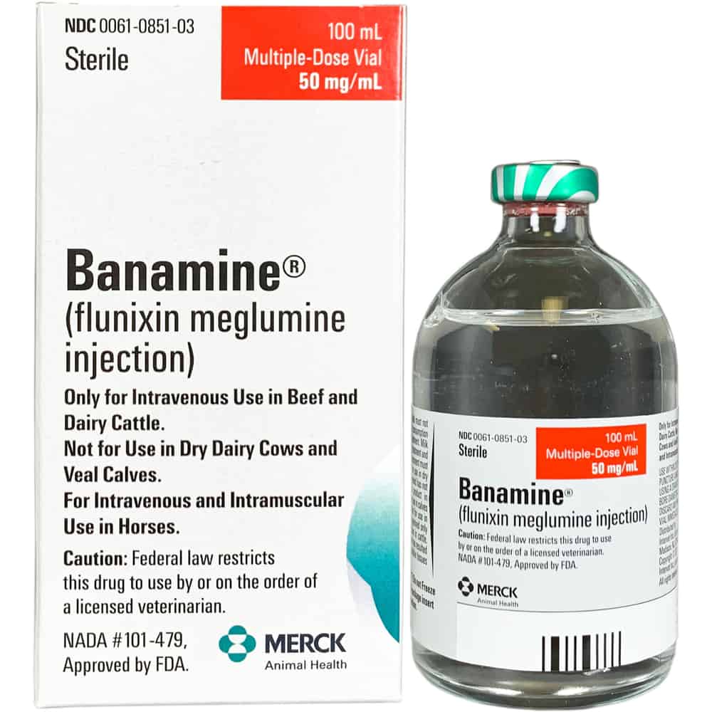 Banamine is an injectable solution for horses that is recommended for the alleviation of inflammation and pain associated with musculoskeletal disorder. It is a non-steroidal anti-inflammatory drug (NSAID) that is also recommended for the alleviation of visceral pain associated with colic in horses. Banamine quickly controls inflammatory responses with an onset of activity within two hours of administration. It is safe to use as it is non-narcotic, non-steroidal. Banamine can also be used in cattle for reasons not listed here. Banamine requires a prescription from your veterinarian.